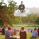 地面に足がつかず、人々よりも少し高い位置にいます。